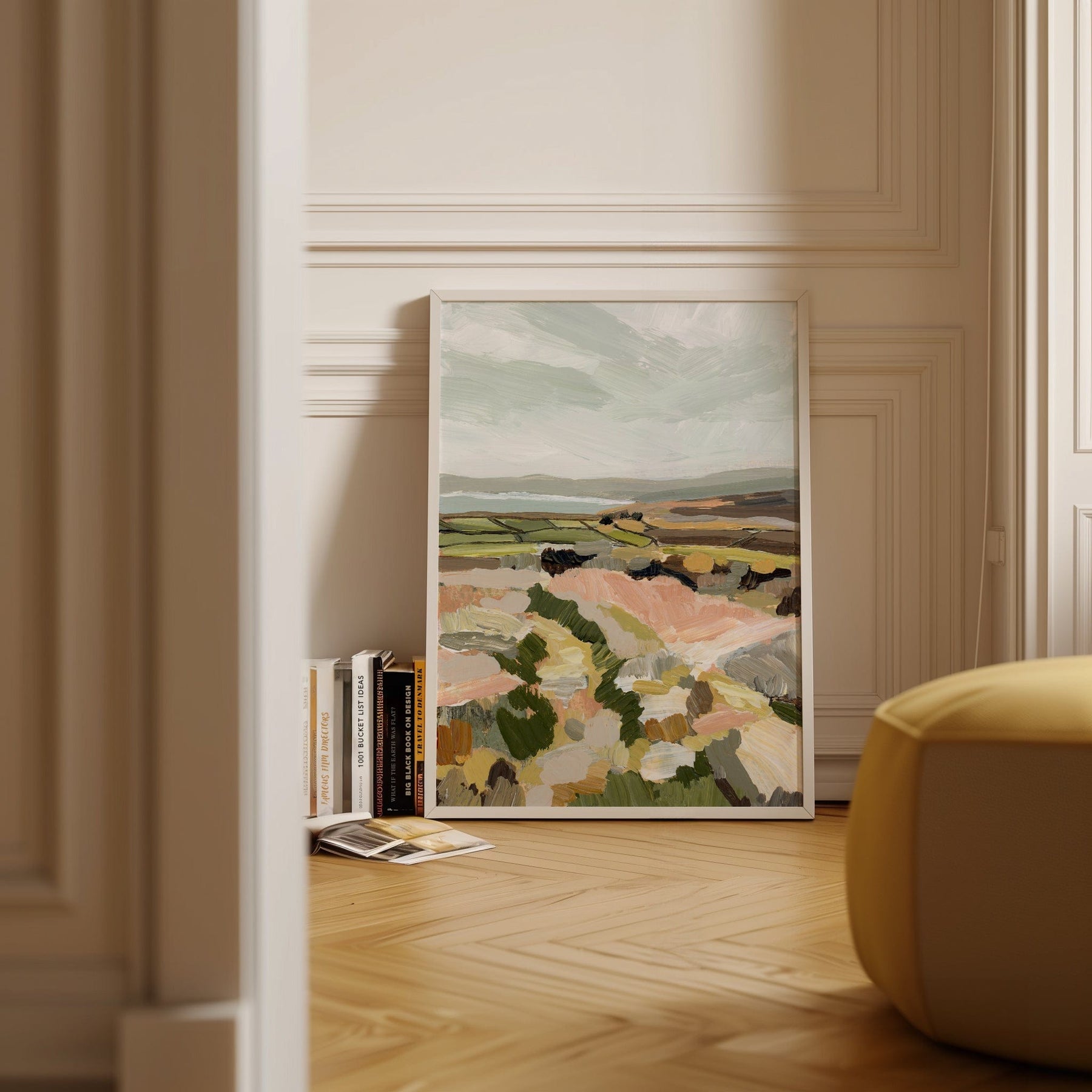 This painting was inspired by Cornwall’s rolling hills and rugged charm. The soft greens and earthy pinks capture that windswept beauty of the English countryside by the sea.