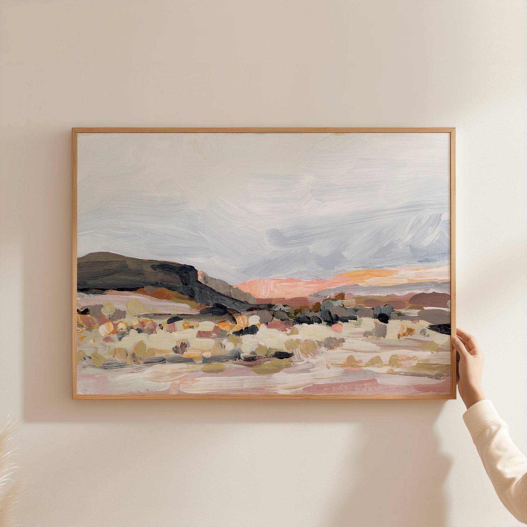 I painted this piece inspired by my love of wide-open desert plains. The warm blush tones against dark ridges capture that fleeting light you only catch for a few minutes at sunset, when the whole valley seems to glow.
