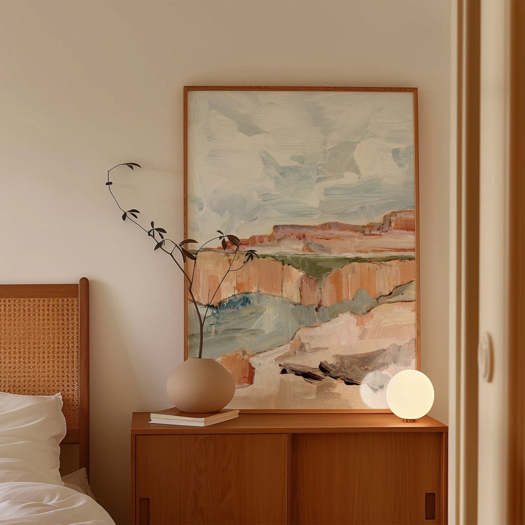 Ravine was inspired by one of my favorite camping spots, where the canyons cut sharply through the desert landscape. I painted it to capture the mix of rugged cliffs and open skies that make the place so memorable. The colors and shapes always stay with me long after we leave.