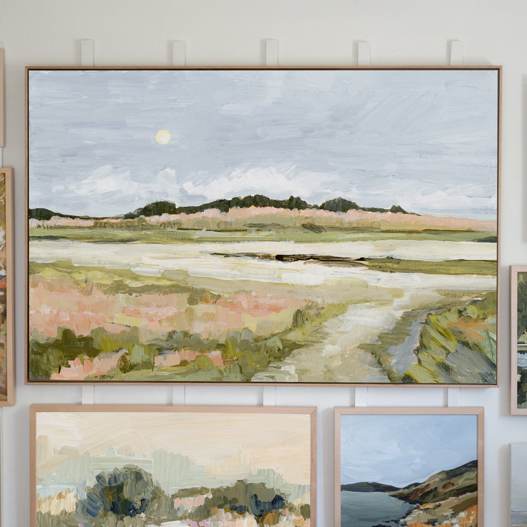 This painting was inspired by quiet Cape evenings, when the moon rises over wide stretches of marsh and the colors soften into muted greens, pinks, and blues.